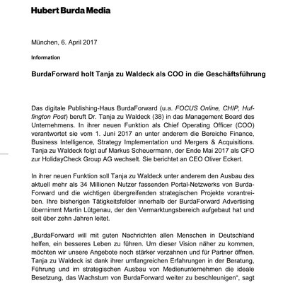 In ihrer neuen Funktion soll Tanja zu Waldeck unter anderem den Ausbau des aktuell mehr als 34 Millionen Nutzer fassenden Portal-Netzwerks von BurdaForward und die wichtigen übergreifenden strategischen Projekte vorantreiben. Ihre bisherigen Tätigkeitsfelder innerhalb der BurdaForward Advertising übernimmt Martin Lütgenau, der den Vermarktungsbereich aufgebaut hat und seit über zehn Jahren leitet. Tanja zu Waldeck folgt auf Markus Scheuermann, der Ende Mai 2017 als CFO zur HolidayCheck Group AG wechselt. Sie berichtet an CEO Oliver Eckert.
