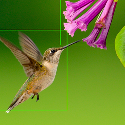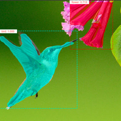 Die „Objekterkennung“ findet alle Objekte in einem Bild und klassifiziert jedes einzeln, um ein Bild etwa automatisch mit Hashtags versehen zu können. Im Beispielbild wären das die Tags „Vogel“, „Tier“ und „Blume“: