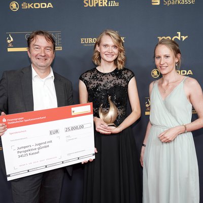 Die Goldene Henne für „Charity“ verbunden mit einer Spende in Höhe von 25.000 Euro vom Ostdeutschen Sparkassenverband geht an „Die Jumpers – Jugend mit Perspektive gGmbH“. Die Initiative engagiert sich unter dem Motto „Wertschätzung und Perspektiven für jedes Kind“ seit 2010 bundesweit in Stadtteil- und Schulprojekten für benachteiligte Kinder und Familien, um ihren Selbstwert zu stärken und ihre persönliche Entwicklung zu fördern. In den Kinder- und Familienzentren von Jumpers, unter anderem in der benachteiligten Region in Sassnitz, haben Kinder die Möglichkeit, sich durch kostenfreie Bildungs-, Sport-, Musik- und Kreativangebote weiterzuentwickeln. Durch gemeinsame Mahlzeiten, Ferienspiele und Freizeiten erhalten die Kinder eine Perspektive für ein selbstbestimmtes Leben. Geschäftsführer Thorsten Riewesell und Victoria Wenzel, Projektleiterin der Jumpers Sassnitz nahmen die Goldene Henne stellvertretend für alle Unterstützer der Initiative entgegen.