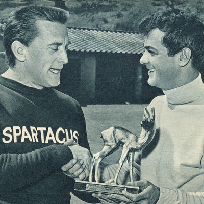 In den 50ern überreichte der muskelgestählte Kirk Douglas seinem „Spartacus“-Kollegen Tony Curtis den Bambi in Hollywood. Die Film-Revue ließ über diese Zeremonie, die der BAMBI-Feier am 15. März 1959 in Karlsruhe vorausging, einen Kurzfilm drehen.