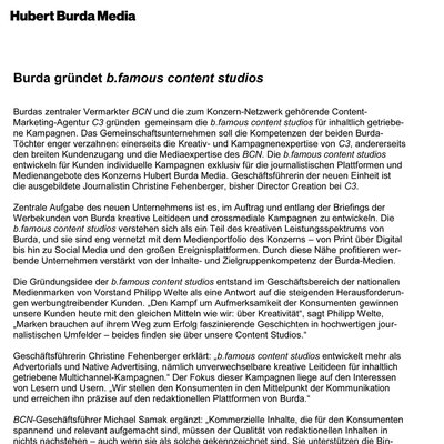 Burdas zentraler Vermarkter BCN und das Content Marketing-Netzwerk C3 gründen als 50/50-Joint Venture die b.famous content studios. Die Aufgabe des neuen Studios ist es, maßgeschneiderte und crossmediale Content-Kampagnen für Werbekunden exklusiv mit den Medienmarken von Hubert Burda Media zu entwickeln. Christine Fehenberger ist die Geschäftsführerin der neuen Einheit und erklärt, wofür die b.famous content studios stehen: