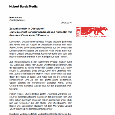 Deutschlands größtes People-Medium Bunte hat am Abend des 29. August in Düsseldorf erstmals den New Faces Award Show an Nachwuchstalente aus der deutschen Musikbranche vergeben. Die Sängerin Nessi wurde in der Kategorie „Music“ ausgezeichnet, Kiddo Kat durfte sich über den begehrten Roten Panther in der Kategorie „Social“ freuen.