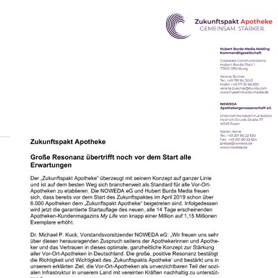 Der „Zukunftspakt Apotheke“ überzeugt mit seinem Konzept auf ganzer Linie und ist auf dem besten Weg sich branchenweit als Standard für alle Vor-Ort-Apotheken zu etablieren. Die NOWEDA eG und Hubert Burda Media freuen sich, dass bereits vor dem Start des Zukunftspaktes im April 2019 schon über 6.000 Apotheken dem „Zukunftspakt Apotheke“ beigetreten sind. Infolgedessen wird jetzt die garantierte Startauflage des neuen, alle 14 Tage erscheinenden Apotheken-Kundenmagazins My Life von knapp einer Million auf 1,15 Millionen Exemplare erhöht.