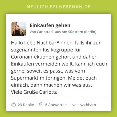 1) Bieten Sie Nachbarn aus Risikogruppen Ihre Hilfe auf Nebenan.de oder über einen Aushang im Treppenhaus an, der hier heruntergeladen werden kann. Ältere Menschen, die zu den Corona-Risikogruppen gehören, haben unter Umständen keinen Zugang zum Internet. So können Sie sich mit Ihren Nachbarn auch ganz analog besser vernetzen.