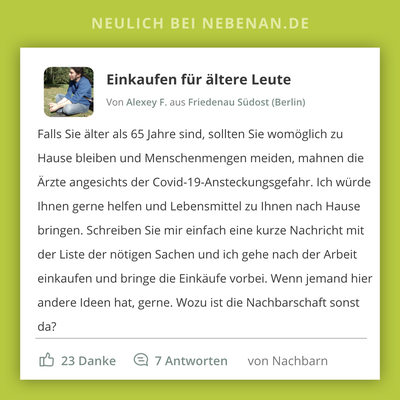 Die Gründer von Nebenan.de verzeichnen derzeit einen Anstieg an Hilfsangeboten auf der Plattform: Einkaufen für ältere Nachbarn oder der Gang zur Apotheke für Menschen mit Vorerkrankungen sind die häufigsten Angebote. Zudem ruft Nebenan.de seine Mitglieder aktiv dazu auf, sich zu unterstützen und zu vernetzen (mehr dazu hier). Was Sie tun können: