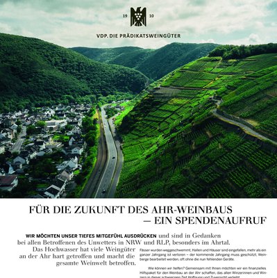 Nach dem schweren Unwetter in Nordrhein-Westfalen und Rheinland-Pfalz, von dem auch die Weinbauregion Ahr betroffen ist, unterstützt Gault&Millau gemeinsam mit weiteren Marken des BurdaVerlags einen Spendenaufruf des Verbands Deutscher Prädikatsweingüter (VDP). Gault&Millau, Focus, Bunte, Slowly Veggie sowie weitere Burda-Magazine stellen Anzeigenplätze zur Verfügung und veröffentlichen den Spendenaufruf des VDPs. Die Spenden kommen den Weingütern der Ahr-Region und dem Wiederaufbau des Weinanbaus zugute.