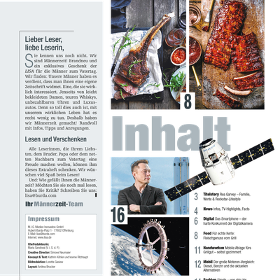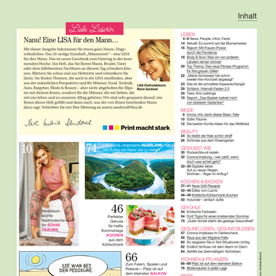 „Mit dieser Ausgabe bekommen unsere Leserinnen etwas ganz Neues, Ungewöhnliches: Das 24-seitige Extraheft ‚Männerzeit‘ - eine Lisa für den Mann. Das ist unser Geschenk zum Vatertag in der kommenden Woche. Es ist ein Heft, das die Lisa-Leserinnen ihrem Mann, Bruder, Vater oder auch dem hilfsbereiten Nachbarn an diesem Tag schenken können. Darin geht es um Themen, die auch in der Lisa stattfinden, aber aus der männlichen Perspektive und für Männer. Food, Technik, Auto, Ratgeber, Mode & Beauty – aber nicht abgehoben für Hipster mit dickem Konto, sondern für die Männer, die wir lieben, die mit uns leben und zu unserem Alltag gehören.“