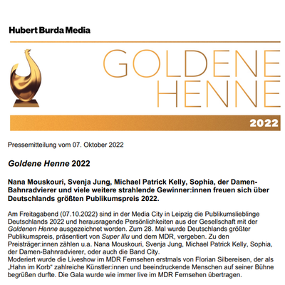 Am Freitagabend (07.10.2022) sind in der Media City in Leipzig die Publikumslieblinge Deutschlands 2022 und herausragende Persönlichkeiten aus der Gesellschaft mit der Goldenen Henne ausgezeichnet worden. Zum 28. Mal wurde Deutschlands größter Publikumspreis, präsentiert von Super Illu und dem MDR, vergeben. Zu den Preisträger:innen zählen u.a. Nana Mouskouri, Svenja Jung, Michael Patrick Kelly, Sophia, der Damen-Bahnradvierer, oder auch die Band City.