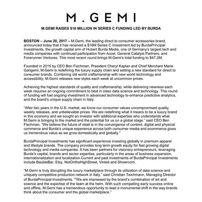“After two years in the U.S. market, we know our consumer values uncompromised quality, weekly releases, and unbelievable prices. We are redefining what it means to be a luxury brand in this economy and we sought an investor with additional expertise who understands what M.Gemi is bringing to the market and the potential for us on a global stage. We believe the future of retail is in the convergence of content, digital and physical commerce and Burda’s unique experience across both consumer media and ecommerce gives us tremendous value as we grow domestically and globally.”