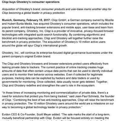 Cliqz GmbH, a German company owned by Mozilla and Hubert Burda Media, has bought the popular Ghostery brand and its anti-tracking browser extensions and mobile apps. Ghostery – headquartered in New York City – is specialised in anti-tracking and counts more than 10 million users worldwide. With the acquisition of Ghostery, Cliqz spurs its international growth and opens its first office in the U.S.