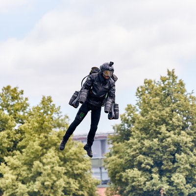 The so-called "Rocket Man" Richard Browning (Gravity Industries) showed a possible future scenario in his self-developed jet suit: In front of the eyes of numerous conference topics, he took off on a spectacular flight into the air on the Bayreuth university campus.