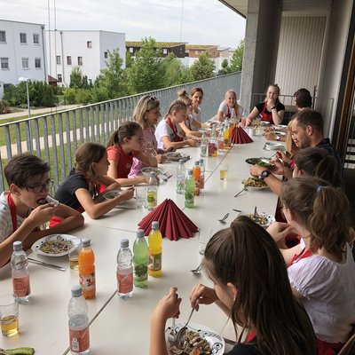 The teachers Barbara Brunner and Alexander Korfhage, who offer cooking courses as an elective subject in the school kitchen themselves, had asked Meine Familie & ich to come to Erding. They are pleased with the very successful morning: Everyone had a lot of fun, the food tasted great and, in terms of learning something new, not only the kids benefited. “I picked up one or two tricks from Jörg as well”, says Alexander Korfhage, laughing. “I’ve no idea why I have been peeling and deseeding a melon in such a complicated way so far. Jörg’s method is very simple, a lot quicker and more of the melon is left to be eaten as well.”