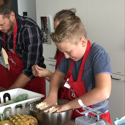 13 students from grades six to eleven had gathered at the school kitchen to create a three-course menu together on Thursday. They had to produce curry muffins, chicken stew with vegetables and noodles, as well as crunchy candies with quark filling and fruit salad. “The girls and boys have really thrown themselves into it today”, says Jörg Götte, visibly pleased. “They were all very concentrated and pitched in brilliantly: whether chopping things, kneading dough, cutting up the chickens or tidying up the kitchen and washing up after having lunch together, which is part of the job as well, after all”, the chef says, full of praise.