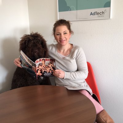 My owner's name is Nadine Hey and she works as Head of Creative Services at the Adtech Factory in Munich and Offenburg. She sits at her desk a lot and makes phone calls. Then she wears headphones, which is handy, because she has one free hand to scratch me. That's also good for the other person in the line: Stroking dogs relaxes the vegetative nervous system, I read in one of my owner's magazines.