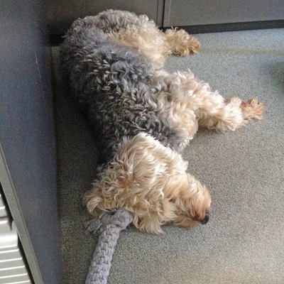 I work here part-time. I'm in the office every Wednesday at half past nine and sometimes on one additional day. Most times, I bring my soft toy dog with me. When I carry it to the office, everyone looks jealous and sometimes someone tries to take it away from me. But then we fight for it and I win every time! At noon my dog mom and I run to the river and lake. There I can have a drink, bathe and look at the goats. They live in a big kennel and smell so interesting. Sometimes we happen to meet Charlie or Filou, who also work with us. In the afternoon I sleep on my pillow under my desk. Sometimes I dream, pedal with my paws, woof or snore quietly. Around half past six we make our way to the car and I'm looking forward to my evening walk.